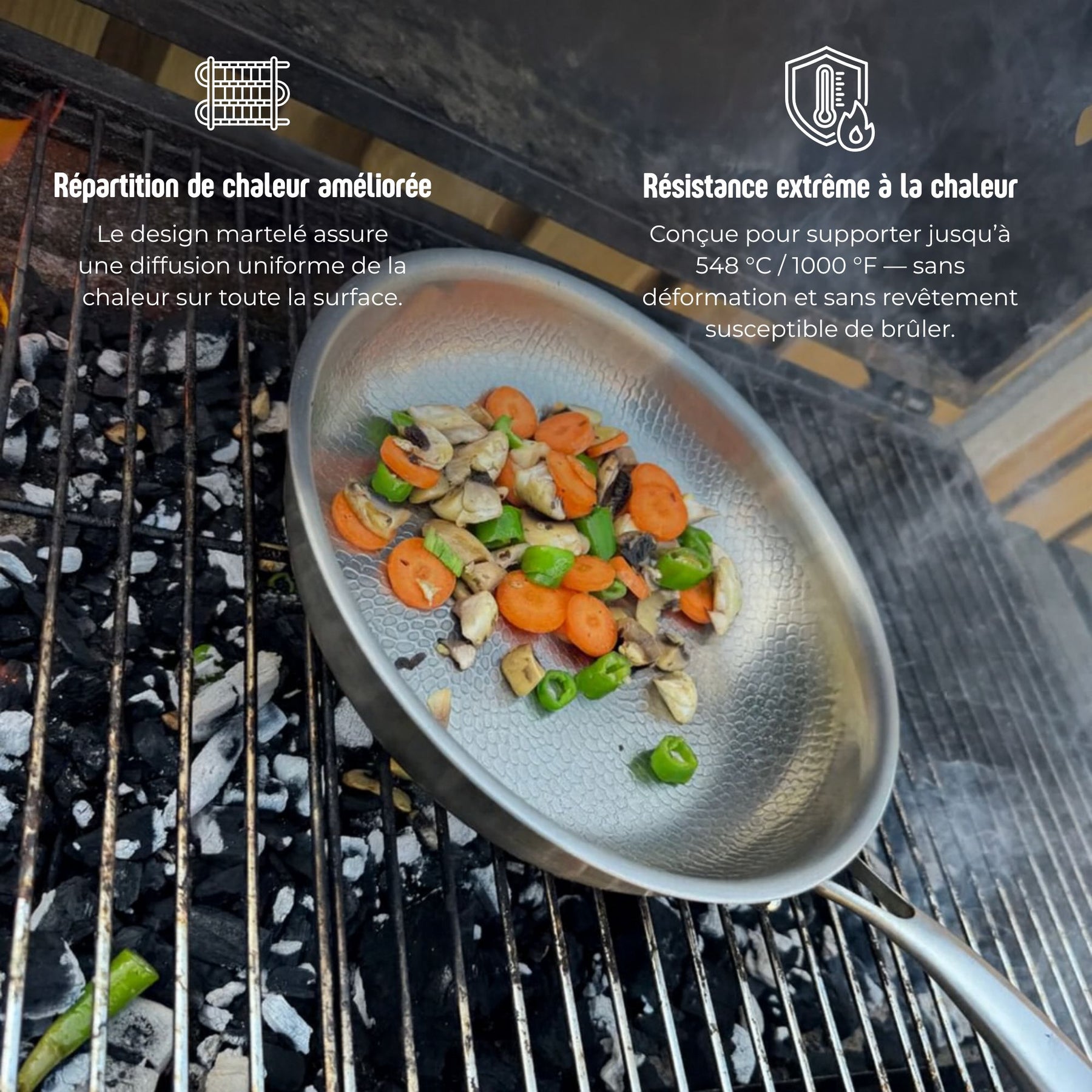 - Surface de cuisson en titane pur — le seul matériau en contact avec vos aliments : non toxique, résistant aux rayures et naturellement antiadhésif.